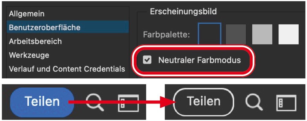 Ein besonders auf kleinen Monitoren sehr störendes Ärgernis der letzten Photoshop-Version lässt sich entfärben: die hellblaue »Teilen«-Schaltfläche. In den Voreinstellungen finden Sie unter »Benutzeroberfläche« dafür eine neue Option, die ausschließlich dafür sorgt, dass sich der auffällig blaue Button in eine farbneutrale Version ändert. Ein Photoshop-Neustart ist für die Umstellung nicht erforderlich.