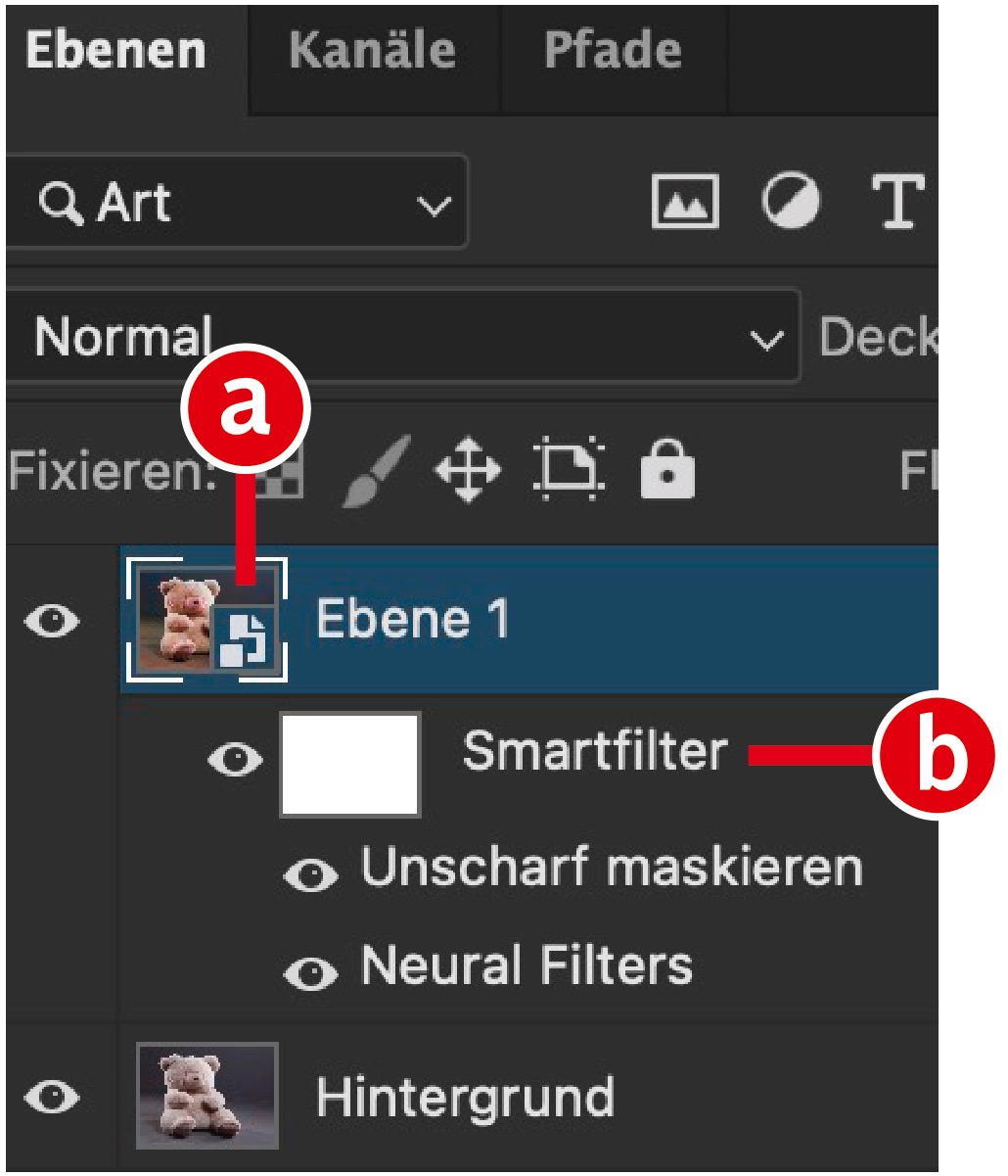 Smartobjekt-Ebenen (a) ermöglichen das verlustfreie mehrfache Transformieren von Ebenen und das Anwenden von Smartfiltern. Sie können jede Ebene mit einem Rechtsklick und »In Smartobjekt konvertieren« umwandeln. Skalieren, Drehen und Verformen erfolgen anschließend non-destruktiv. Die meisten Filter lassen sich auf eine Smartobjekt-Ebene anwenden und erscheinen dann dort als Smartfilter, die jederzeit mit einem Doppelklick editiert werden können (b).