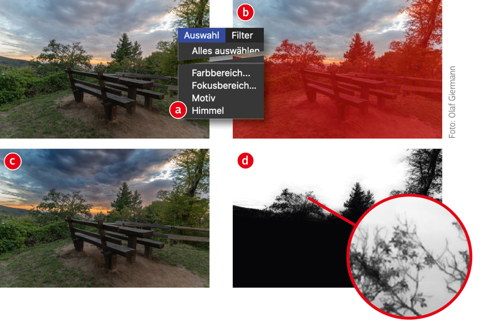 Über »Auswahl > Himmel« (a) selektiert Photoshop automatisch den Himmel (b) – hier im Maskierungsmodus gezeigt. Das funktioniert, unabhängig von der Bewölkung des Himmels, erstaunlich gut. Die Auswahl lässt sich zum Beispiel nutzen, um den Himmel mit einer Einstellungsebene vom Typ »Gradationskurve« kontrastreicher zu gestalten (c). Die resultierende Maske (d) ist keine harte Schwarzweiß-Maske, sondern weist feine Grauabstufungen auf. Dadurch erhalten Sie keine unschönen Säume und können die Maske mit »Nachbelichter« und »Abwedler« bei Bedarf weiter optimieren.