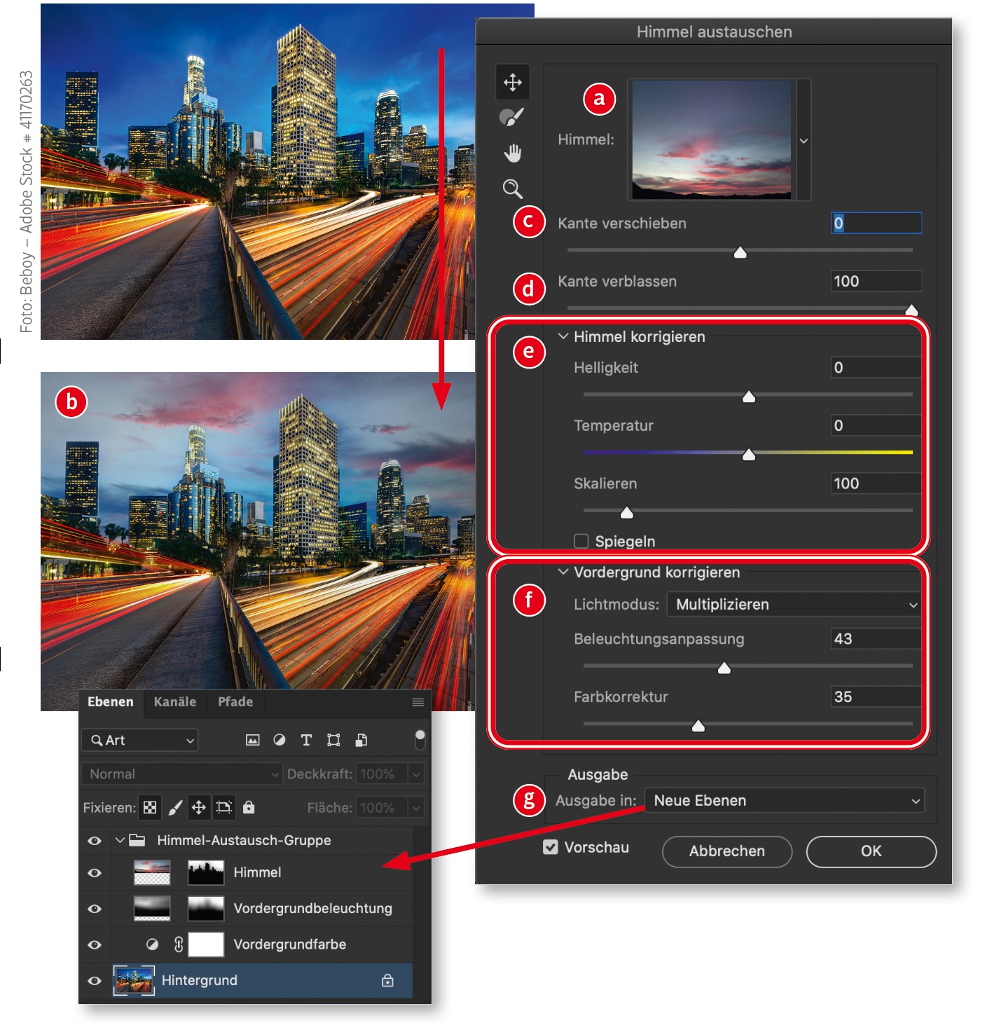 Möchten Sie einen langweiligen Himmel durch einen anderen ersetzen, sollten Sie nicht den manuellen Weg über die Himmelsauswahl gehen, sondern den neuen Dialog »Bearbeiten > Himmel austauschen« verwenden. Wählen Sie eine der vorinstallieren Himmelsvorlagen (a), so wird automatisch der Himmel erkannt, durch die Vorlage ersetzt und der Vordergrund in Helligkeit und Farbe angepasst (b). Oft müssen Sie gar keine weiteren Änderungen …