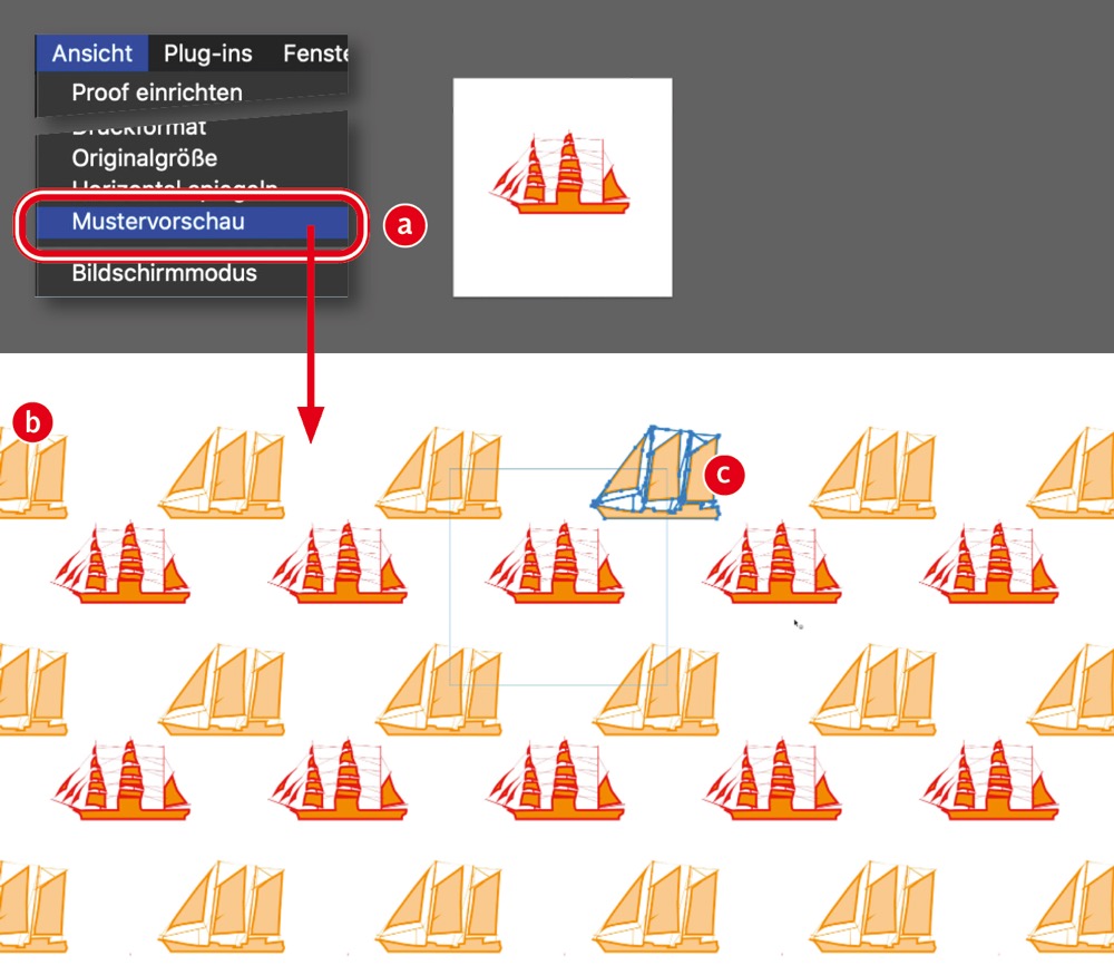 Nahtlose Muster zu erzeugen, brauchte es bislang in Photoshop viel Tricksereien mit dem Filter »Verschiebungseffekt« und bei eher grafischen Mustern viel Erfahrung und wiederholtes Ausprobieren der erzeugten Muster. Das ist nun einfacher geworden. Aktivieren Sie »Ansicht > Mustervorschau«, wird das aktuelle Dokument (a) auf der Arbeitsfläche gekachelt dargestellt (b). Hier können Sie nun genau die Wiederholungen beurteilen und weitere – auch über die Begrenzung des Dokuments hinausragende – Elemente, wie hier das orange Segelschiff, hinzufügen (c). Wählen Sie in dieser Ansicht »Bearbeiten > Muster festlegen«, entspricht die erzeugte Mustervorgabe exakt der Vorschau. Falls Sie mit Pixel-Elementen, also Fotos arbeiten, sollten diese als Smartobjekte vorliegen, da die außerhalb der Dokumentgrenzen liegenden Bereiche sonst nicht richtig berücksichtigt werden.