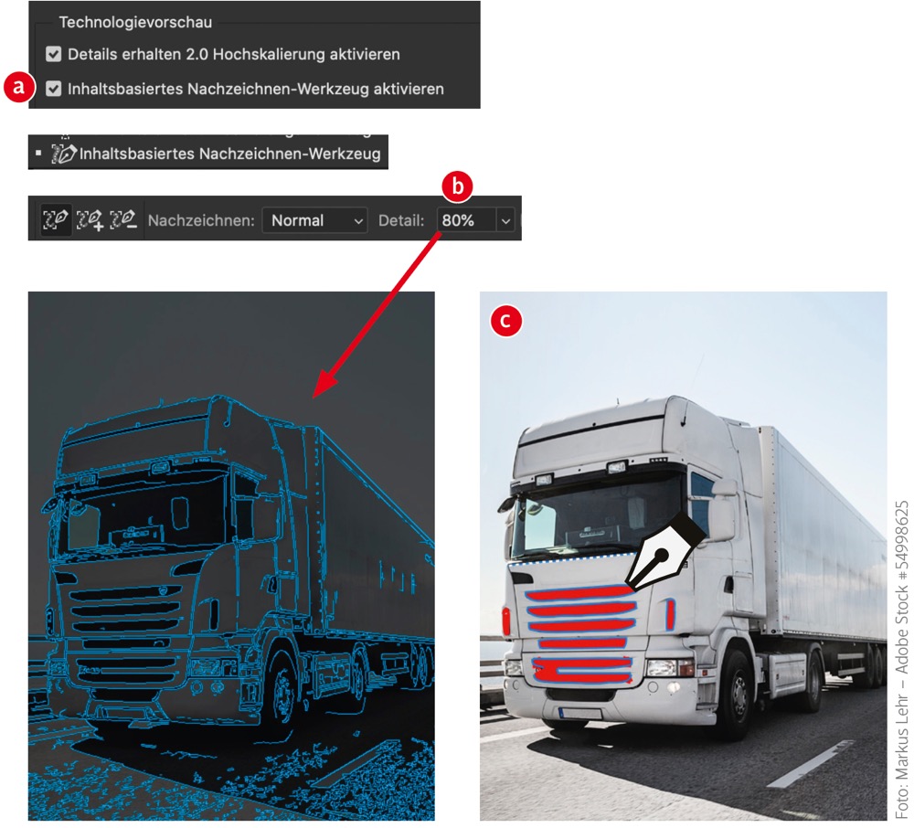 Dieses Werkzeug lässt sich in den Voreinstellungen unter »Technologievorschau« aktivieren (a). Über »Detail« (b) legen Sie den Kantenschwellenwert fest. Während Sie den Regler geklickt halten, erscheint eine Vorschau …