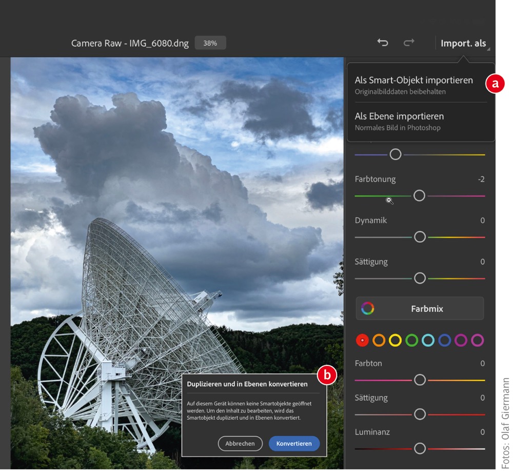 Durch die Integration von Camera Raw kann man Raw-Dateien nun auch auf dem iPad direkt in Photoshop importieren. Zuvor war das nur mit JPEG-, TIFF-, PNG-, PSB- oder PSD-Dateien möglich. Raws ließen sich nur von Lightroom (Mobile/Cloud) an Photoshop übergeben – und dies nur als gerasterte Ebene. Mit der Einführung von Camera Raw kann man Raws jetzt auch als Smartobjekt öffnen (a). Dadurch sind die Raw-Einstellungen bei Bedarf nachträglich am Desktop-Rechner noch optimierbar. Auf dem iPad lässt sich der Smartobjekt-Inhalt dagegen nicht wie gewohnt per Doppelklick nochmals in Camera Raw öffnen. Stattdessen wird das Smartobjekt dupliziert und gerastert, wenn man es versucht (b). Eine Optimierung der Raw-Entwicklung in der Desktop-Version von Photoshop ist auch deshalb meist nötig, weil …