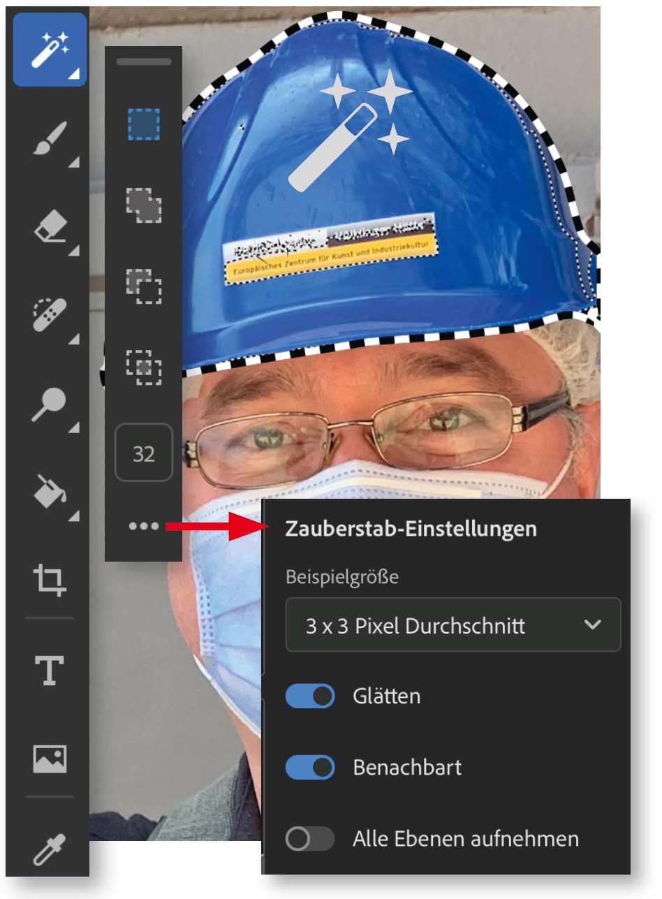 Eines der ältesten Photoshop-Werkzeuge hat Einzug auf dem iPad gehalten: der Zauberstab. Damit kann man nun endlich einfache, farbbasierte Auswahlen vornehmen. Die von der Desktop-Version bekannten Optionen finden Sie im Ellipse-Menü. Warum so viele Begriffe der iPad-Version falsch und sinnentstellend sind, wo doch bessere Übersetzungen der Desktop-Version schon vorliegen, bleibt ein Rätsel. So wurde hier etwa aus dem »Aufnahme-Bereich« die »Beispielgröße«.