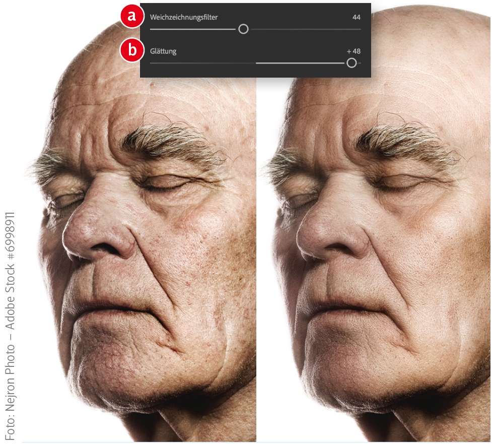 Wurde ein Gesicht erkannt, eignet sich der Filter »Hautglättung« zur Verschönerung des Hautbildes. Der Filter glättet die Haut, ohne die Poren völlig zu entfernen, und reduziert Hautstörungen wie Rötungen oder Akne. Die Effektstärke regulieren Sie mit dem Parameter »Weichzeichnungsfilter« (a). »Glättung« (b) soll harte Schatten reduzieren – der Unterschied zwischen minimaler und maximaler Einstellung ist aber vernachlässigbar gering.