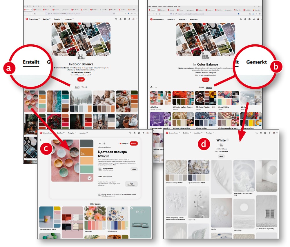 In einem Profil gibt es zwei Hauptbereiche. Bei »Erstellt« (a) sehen Sie Bilder, Composings oder Infografiken, die von dem Profil-Inhaber als Pins gesichert wurden. Hinter dem Begriff »Gemerkt« (b) verbergen sich die Pinnwände. Klicken Sie auf einen Pin, wird er maximiert (c). Neben dem Visual wird die Überschrift und der Text eingeblendet. Öffnen Sie per Klick eine Pinnwand (d), werden Ihnen zunächst übersichtlich die Visuals der enthaltenen Pins angezeigt. Sie legen Pinnwände thematisch an oder stimmen Pins zum Beispiel farblich aufeinander ab, um einen coolen Look zu kreieren.