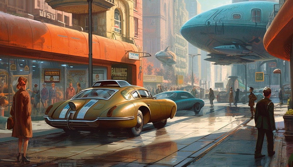 Der Begriff „Retrofuturismus“ beschreibt eine in den 50er und 60er Jahren des letzten Jahrhunderts äußerst populäre Illustrationsweise. Ihr Gegenstand war die Idee der Zukunft, wie sie vor rund einem halben Jahrhundert vorherrschte. Der Stil ist bestimmt von einer comicartigen Umsetzung mit viel Sonnenschein und blauem Himmel – charakteristisch für den ungetrübten Fortschrittsglauben der Nachkriegszeit. Wie meine Recherche in Midjourney zeigte, beherrscht die KI den Stil prinzipiell, verbindet ihn aber vor allem mit Autos, Luftfahrt und Architektur. Aufgefordert, ein Bild zu generieren, bei dem Retrofuturismus mit einem eigenen Thema verknüpft ist, produzierte Midjourney 5 eine fast zeitgenössisch moderne Ästhetik ohne retrofuturistischen Charme. Besser, aber immer noch nicht optimal, wurden die Ergebnisse durch Zuhilfenahme von ChatGPT bei der Prompt-Findung.