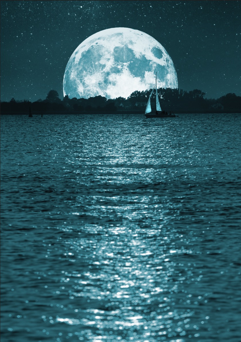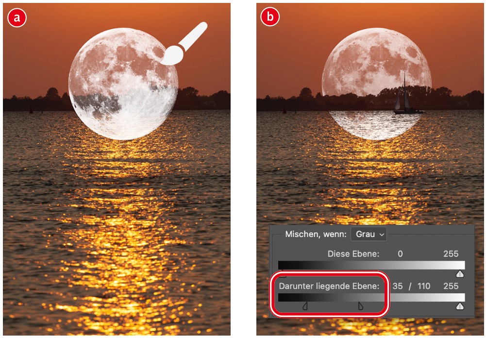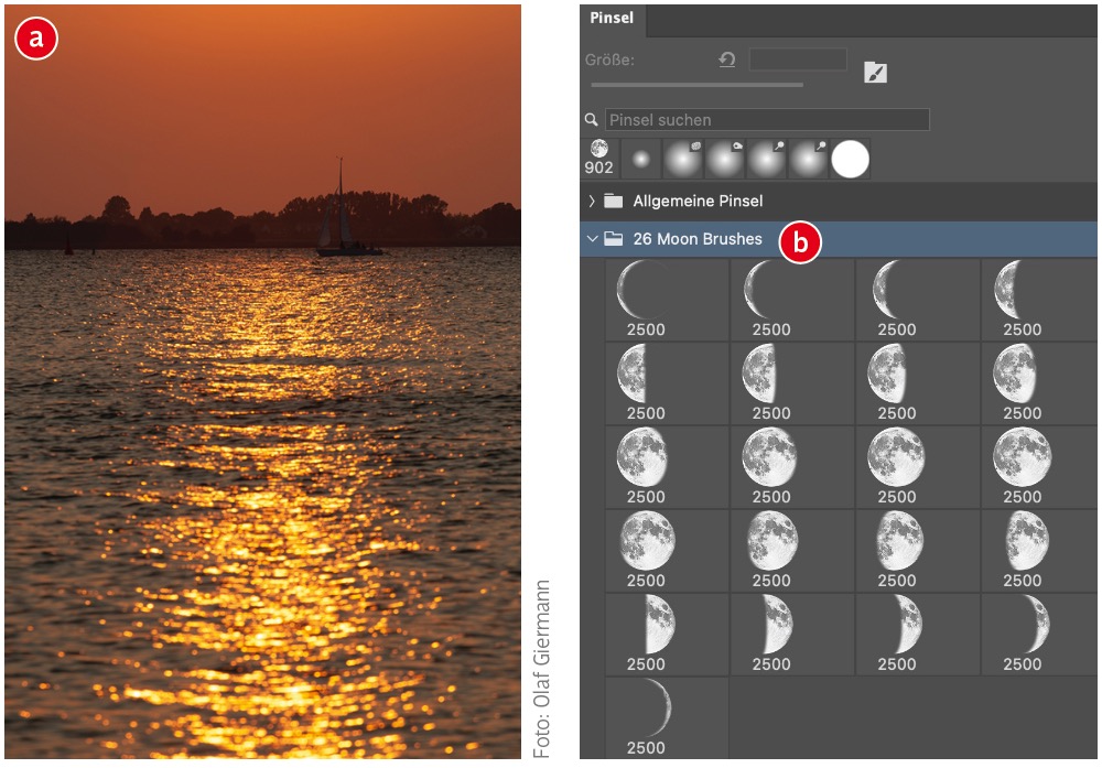 Das Basisfoto (a) habe ich bei einer Bootsfahrt in Richtung Sonnenuntergang (falls es Sie interessiert: mit einer Brennweite von 200 mm bei Blende 9) aufgenommen. Ähnliche Fotos finden Sie zur Not aber auch auf Stock-Plattformen. Wichtig ist, dass die Wellen vom Gegenlicht beleuchtet werden. So ein Wasseroberflächen-Effekt ließe sich natürlich auch in Photoshop oder 3D-Programmen simulieren – der Aufwand wäre aber unvergleichlich höher, als ein passendes Foto zu verwenden. Ähnliches gilt für den (immer gleich aussehenden) Vollmond: Den müssen Sie für solche Montagen nicht selbst fotografieren. Holen Sie sich das unter www.docma.info/22315 herunterladbare Pinsel-Set (b).