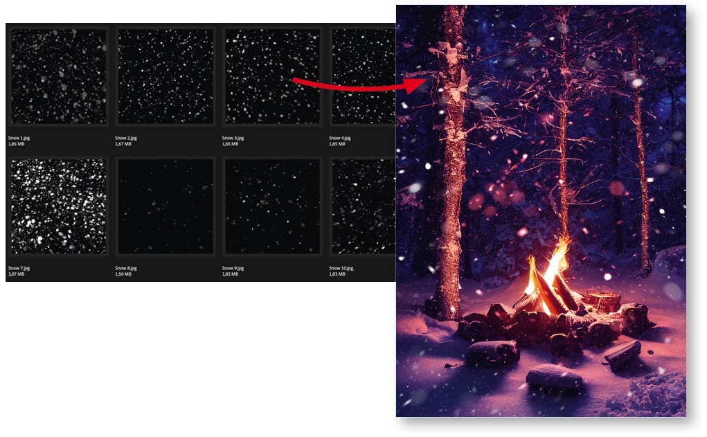 Laden und entpacken Sie die ZIP-Datei, erhalten Sie 20 verschiedene Fotos von fallendem Schnee zur freien Verwendung. Ziehen Sie eines der Bilder als Überlagerung in ein dunkles oder abgedunkeltes Foto und transformieren Sie es, so dass es das gesamte Bild überlagert. Ändern Sie den Ebenenmodus auf »Negativ multiplizieren«.