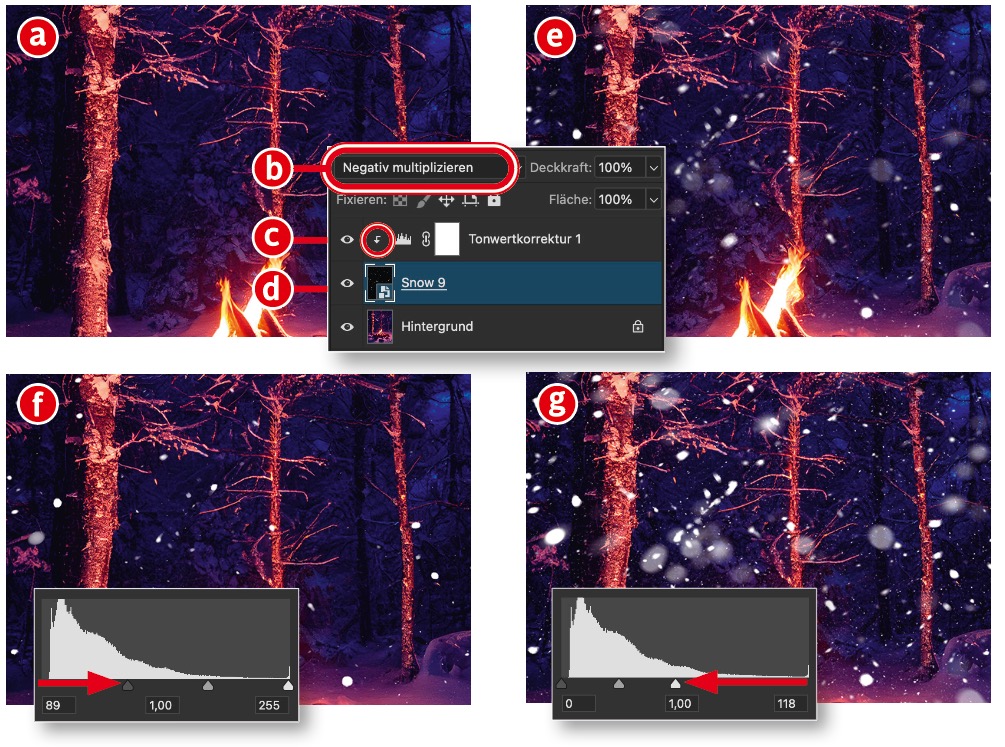 Wenn Sie dem Ausgangsfoto (a) eine Schnee-Ebene (d) im Modus »Negativ multiplizieren« (b) überlagern, entspricht das Ergebnis (e) vielleicht nicht ganz Ihren Vorstellungen. Die Sichtbarkeit der Schneeflocken lässt sich zum …