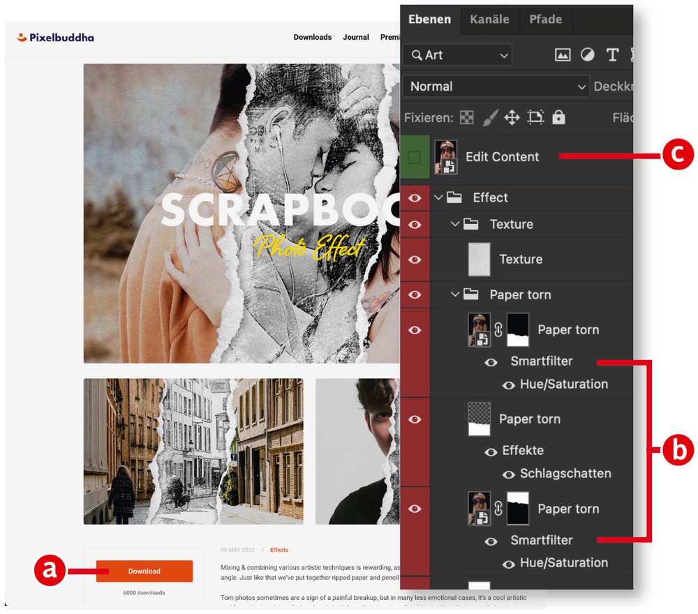 Das Mock-up simuliert ein Foto, bei dem in der Mitte ein Streifen herausgerissen und der fehlende Teil durch eine Zeichnung ergänzt wurde. Indem Sie auf die oberste Ebene „Edit Content“ (c) doppelklicken, öffnen Sie den Smartobjekt-Inhalt in einem neuen Fenster. Dort fügen Sie mittels Drag-and-drop oder Kopieren/Einfügen ein eigenes Foto ein. Durch Speichern aktualisieren …