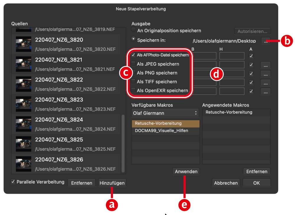 Makros lassen sich auch automatisiert auf mehrere Bilder anwenden. Rufen Sie dafür »Datei > Neue Stapelverarbeitung« auf. Links im Dialog legen Sie die zu verarbeitenden Bilder über die Schaltfläche »Hinzufügen« (a) fest. Rechts definieren Sie den Zielordner (b), das benötigte Dateiformat (c) und die gewünschte Breite und Höhe (d). Rechts unten können Sie aus den im »Bibliotheken«-Studio gespeicherten Makros auswählen und diese per »Anwenden«-Schaltfläche (e) aktivieren. Klicken Sie auf »OK«, um die Stapelverarbeitung zu starten.