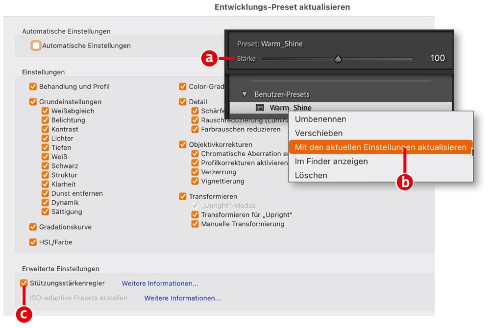 An oberster Stelle im Presets-Panel finden Sie jetzt den Parameter »Stärke« (a), mit dem Sie zuvor angewandte Presets in ihrer Wirkung anpassen können. Ziehen Sie den Regler nach links, senken Sie die Deckkraft der Vorgabe. Wie beim Stärke-Regler für Masken lässt sich der Wert für »Stärke« aber auch auf bis zu 200 Prozent erhöhen und damit die Wirkung des Presets verstärken. Die meisten vorinstallierten Vorgaben von Adobe unterstützen diese praktische Funktion von Haus aus. Sollten Sie Presets von Drittanbietern oder benutzerdefinierte Vorgaben einsetzen, bei denen der »Stärke«-Regler nicht funktioniert, können Sie das Preset aktualisieren. Wenden Sie dafür das Preset (ohne anderweitige Korrekturen!) an und wählen Sie dann im Kontextmenü (Rechtsklick auf den Preset-Namen) den Befehl »Mit den aktuellen Einstellungen aktualisieren« (b). Aktivieren Sie im sich öffnenden Dialog »Entwicklungs-Preset aktualisieren« die Option »Stützungsstärkenregler« (c). Im Original heißt diese Option übrigens …