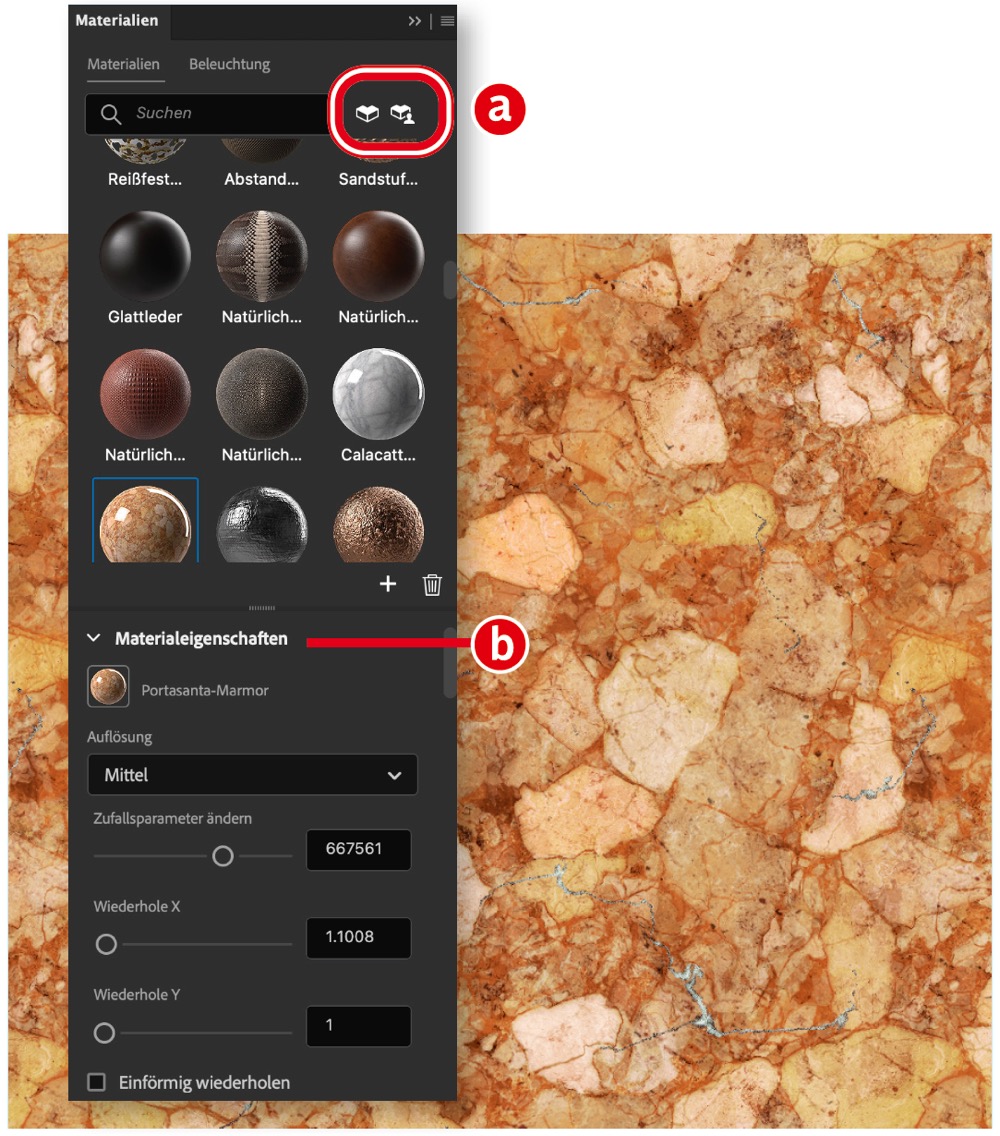 Mit »Fenster > Materialien« hält ein neues Panel in Photoshop Einzug, das erstmals prozedurale, fotorealistische Nahtlos-Muster bietet, wie man sie bisher nur aus 3D-Anwendungen kannte. Prozedural bedeutet, dass diese Muster rein mathematisch generiert werden und sich durch eine Vielzahl von Parametern, die »Materialeigenschaften« (b), variieren lassen. Letztere können für jedes Material unterschiedlich sein und erlauben auch das Ändern der Beleuchtungsrichtung. Texturen dieser Art erzeugt man mit der Software Adobe Substance 3D Designer, die nicht Teil des Creative-Cloud-Abonnements ist. Sie können neben den bereits vorinstallierten aber auf eine Vielzahl von weiteren Vorgaben von Adobe oder der Community über entsprechende Schaltflächen im Bedienfeld zurückgreifen (a).