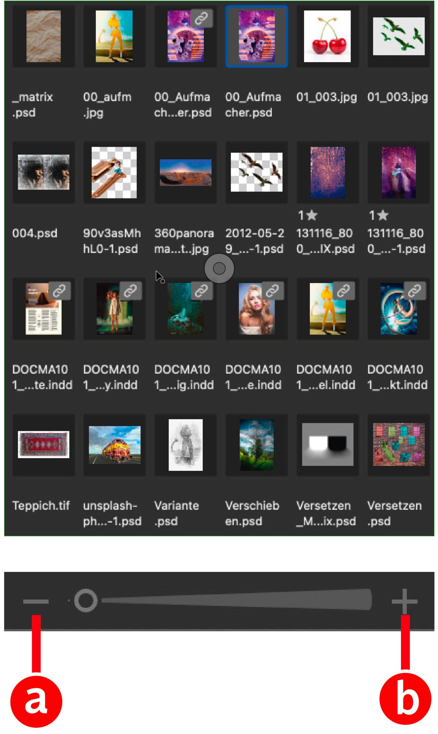 Um ein Bild zu finden oder zu beurteilen, reicht oft schon eine vergrößerte Miniaturansicht aus. Mit dem Schieberegler am unteren Rand des Programmfensters lässt sich deshalb die Thumbnail-Größe einstellen. Kleinere Miniaturen erlauben es, mehr Dateien gleichzeitig im Blick zu haben, während größere mehr Bilddetails zeigen. Klicken Sie auf das Minus- (a) oder das Plus-Symbol (b), um die Miniaturgröße schrittweise zu ändern.