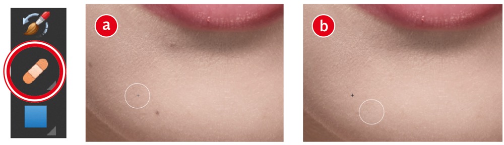 Der »Reparaturpinsel« ist ein hervorragendes Werkzeug, um bei der Beautyretusche Störungen zu entfernen und Bereiche auszubessern. Nachdem Sie den »Reparaturpinsel« in der Werkzeugpalette aktiviert haben, passen Sie die Größe der Pinselspitze der Störung an und wählen einen Referenz-Bereich (a) mit der gedrückten »Alt«-Taste aus, der auf die Störung (b) kopiert werden soll. Der Pinsel verrechnet die beiden Bildinformationen automatisch miteinander.