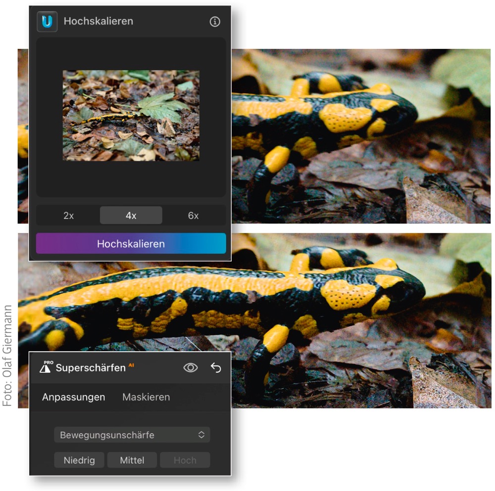 Für mehr Detailreichtum sorgen die in der deutschen Version Hochskalieren und Superschärfen AI genannten Plug-ins. Beide lassen sich kombinieren, um zunächst eine Ausschnittsvergrößerung vorzunehmen und dann leichte Verwacklungen zu reduzieren. Bei mit hohen ISO-Werten aufgenommenen Fotos empfiehlt sich die zusätzliche Anwendung des Plug-ins Rauschfreies Raw. Probieren Sie je nach Motiv eine unterschiedliche Reihenfolge von Rauschreduzierung und Superschärfen aus. Das Hochskalieren sollte jedoch immer als erster Schritt erfolgen. Der Feuersalamander im Bild war recht flink, es war nur wenig Licht vorhanden und mein Objektiv hatte auch nur eine eher kurze Brennweite – der perfekte Anwendungsfall für die Kombination der drei Module zum Hochskalieren, Entrauschen und Schärfen, um den Schnappschuss zu retten.