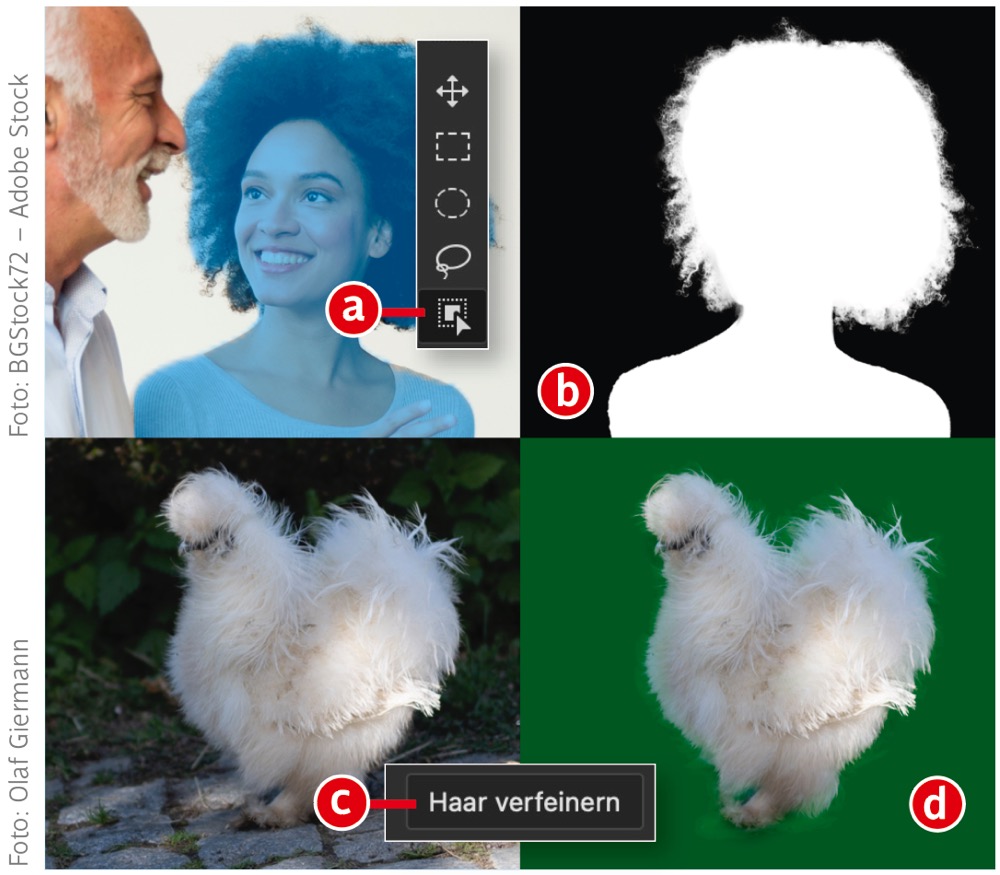 Das »Objektauswahl-Werkzeug« und die Option »Haar verfeinern« wurden funktionell erweitert. Ersteres (a) erkennt nun Porträts und erzeugt mit einem Klick eine Auswahl, die in der Qualität der von »Auswahl > Motiv« entspricht (b). Das bedeutet, dass Haardetails jetzt nicht mehr unbedingt nachträglich in »Auswählen und maskieren« verbessert werden müssen. Tierfreunde wird es freuen, dass die Option »Haar verfeinern« (c) im Dialog »Auswählen und maskieren« neben Porträts nun auch Fell automatisch erkennt. Wie gut das Ergebnis ausfällt, hängt stark von der Fellbeschaffenheit und -länge ab. Sehr kurze, glatte Haare werden dabei meist übersehen; wuscheligeres Fell – oder sogar wie im Beispiel Gefieder (d) – erkennt und verbessert die Funktion jedoch recht zuverlässig. Wie …