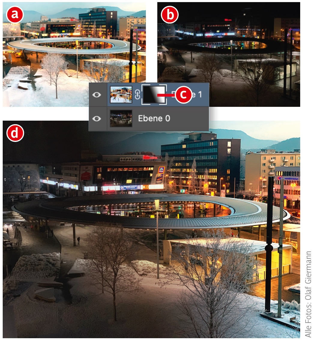 Zwei Ebenen lassen sich mit dem »Verlaufswerkzeug« fließend ineinander überblenden. Laden Sie beispielsweise mit »Datei > Skripten > Dateien in Stapel laden« mit aktivierter Option »Quellbilder nach Möglichkeit ausrichten«, werden diese von Photoshop als Ebenen deckungsgleich übereinandergelegt. Ein interessanter Effekt ergibt sich, wenn Sie hier zwei Fotos benutzen, von deinen eines am Tag (a) und das andere bei Nacht (b) aufgenommen wurde. Beim »Verlaufswerkzeug« (Tastenkürzel »G«) wählen Sie einen Schwarz-zu-Weiß-Verlauf und ziehen in der Ebenenmaske (c) diesen Verlauf auf, um einen fließenden Übergang zwischen der Tag- und der Nacht-Version zu erhalten (d). Für einen exakt horizontalen oder vertikalen Verlauf halten Sie dabei die Shift-Taste gedrückt.