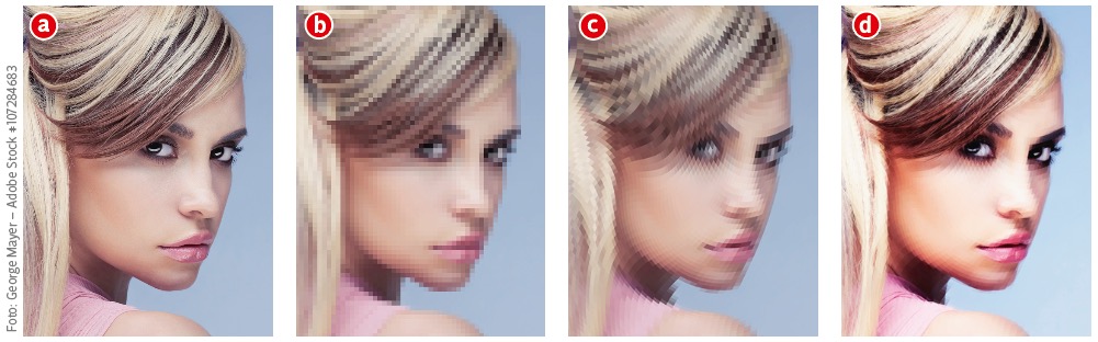 Statt ein Foto (a) allein mit dem »Mosaikeffekt«-Filter zu vergröbern (b), erhalten Sie kreativere Pixelgitter-Strukturen (c), wenn Sie vor seiner Anwendung das Bild strudelförmig verdrehen und es nach der Verpixelung zurückdrehen. Durch Überlagerung etwa im Modus »Ineinanderkopieren« überblenden Sie das Ergebnis für einen subtileren, aktuell angesagten Effekt (d).