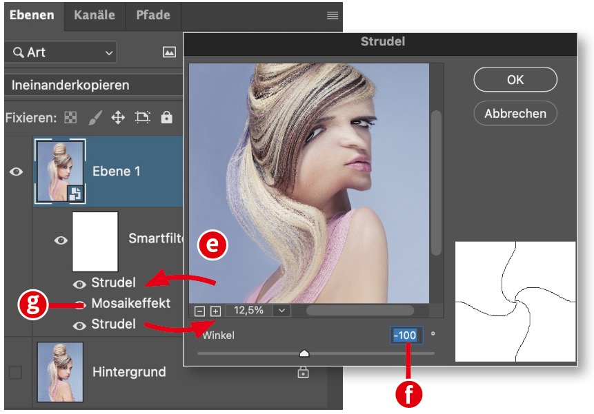 Zur Vorbereitung duplizieren Sie die Hintergrundebene und konvertieren diese in ein Smartobjekt. Auf dieses wenden Sie zunächst den Verzerrungsfilter »Strudel« (e) mit einem negativen Wert (f) an. Über »Filter > Vergröberungsfilter > Mosaikeffekt« (g) verpixeln Sie das Bild. Um die anfängliche Verzerrung wieder zu entfernen, rufen Sie den »Strudel«-Filter erneut auf – jedoch in der Gegenrichtung, wofür Sie nur das Minuszeichen vor dem Wert (f) entfernen müssen.