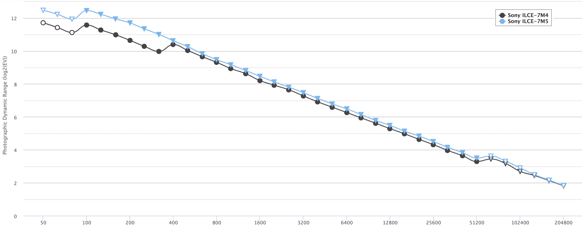 bis ISO 400 zwar vorhanden ist, aber die Messung zeigt ebenfalls, dass der Dynamikumfang nur 12 der versprochenen 16 Blenden abdeckt.