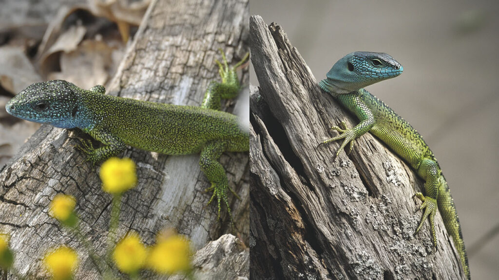 Östliche Smaragdeidechse: Die Männchen der Östlichen Smaragdeidechse sind zur Paarungszeit im Frühjahr zwar prächtig gefärbt, jedoch wird dies im KI-Bild (r.) stark überzeichnet, ebenso die deutliche Abgrenzung der einzelnen Schuppen. Auch die einheitliche Blaufärbung am Kopf, der zu lange Hals und die zu weit hinten positionierte Ohröffnung lassen erkennen, dass es sich nicht um ein echtes Foto der Art (l.) handelt.