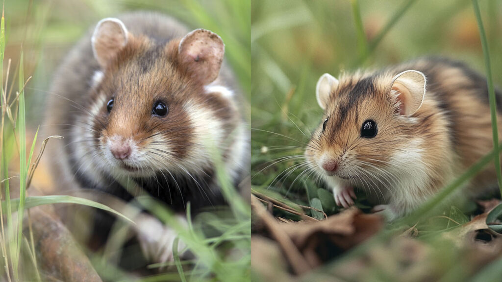 Feldhamster: Die KI-Darstellung (r.) des Feldhamsters ähnelt eher einem Goldhamster. Das echte Tier (l.) ist deutlich größer und massiger, der Kopf ist länger und läuft zur Nase hin spitzer zu. Auch die arttypische braun-weiße Fellmusterung ist deutlich dunkler und kontrastreicher, als es die KI entwirft. Die Unterseite ist bei Feldhamstern schwarz gefärbt, beim KI-generierten Tier ist dort weißes Fell sichtbar. Auch in diesem Beispiel wird die Neigung der KI zur Verniedlichung deutlich. Augen und Kopf sind im KI-Bild deutlich überproportioniert.
