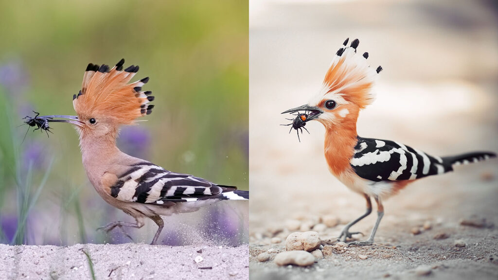 Wiedehopf: Die charakteristische Federhaube des Wiedehopfs (l.) ist in Realität ausgeprägter und sein Schnabel deutlich länger, als es die KI darstellt (r.). Dafür sind ihr die Schwanzfedern deutlich zu lang geraten. Ebenfalls übertrieben hat sie bei der Farbe des Gefieders, das in der Realität gedeckter ausfällt, um den Vogel am Boden zu tarnen. Außerdem verniedlicht die KI das Original: Augen und Kopf sind im Verhältnis zum Körper zu groß geraten. Immerhin richtig zeigt sie, dass Wiedehopfe Insekten fressen – allerdings gelingen diese ihr auch nur leidlich.