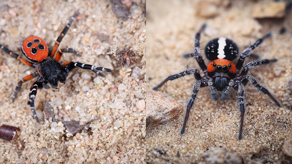 Rote Röhrenspinne: Das Originalbild (l.) zeigt ein Männchen der Roten Röhrenspinne: Es hat einen schwarzen Kopf und einen scharlachroten Hinterleib mit vier schwarzen Punkten, die wie auf einem Würfel angeordnet sind. Die Beine sind schwarz-weiß geringelt und weisen eine ebenfalls rötliche Behaarung auf. Das KI-Bild (r.) ist dagegen von der Realität weit entfernt. Neben der offensichtlich falschen Färbung sind auch die Augen der KI-Spinne viel zu groß geraten und erinnern in ihrer Anordnung eher an eine Springspinne.