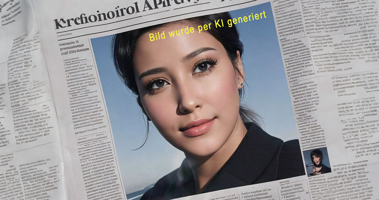 Prompt in Deep Dream Generator/AIVisioon: »generate as a professional photo, a photograph in a newspaper that is explicitly marked as an AI-generated image« Die Zeile „Bild wurde per KI generiert“ wurde manuell eingefügt, da keine entsprechenden Umsetzungen erzeugt wurden. Textdarstellungen werden zwar zunehmend besser, sind aber immer noch weit von einer korrekten Wiedergabe entfernt.