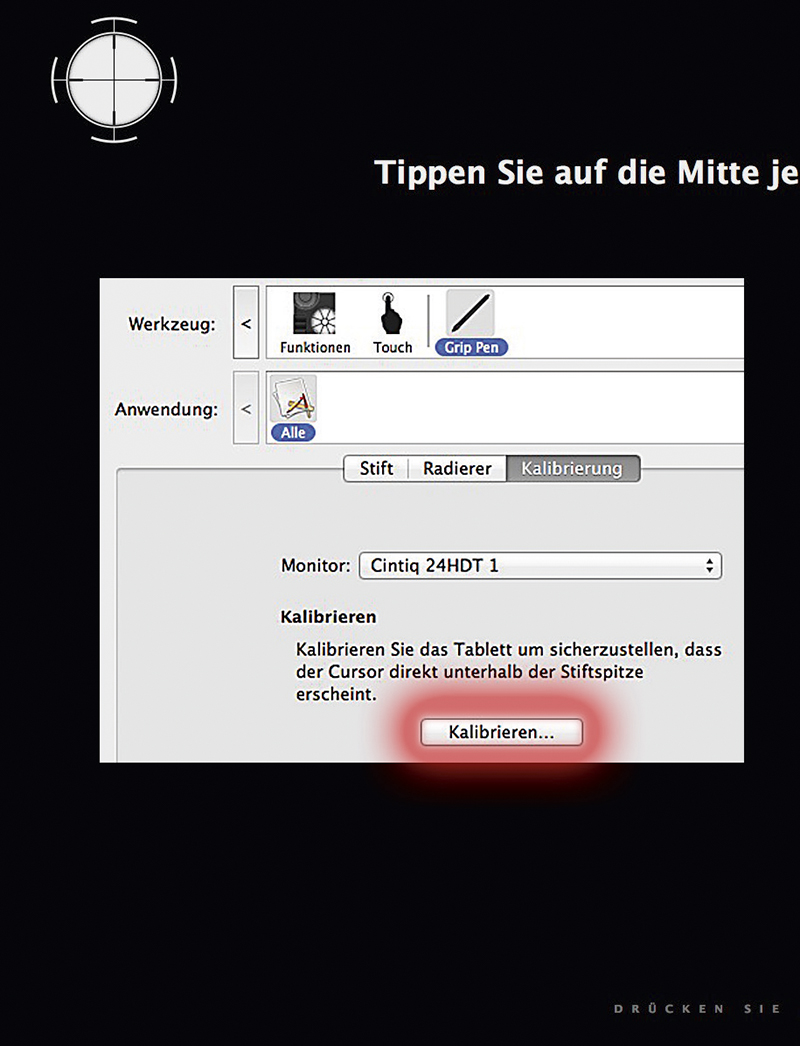 Vor dem Einsatz eines Bildschirmtabletts sollten Sie dieses kalibrieren. Gemeint ist hier nicht die ebenfalls unverzichtbare Optimierung von Helligkeit, Kontrast und Farben, sondern die korrekte Ausrichtung des Cursors an der jeweiligen Stiftposition auf dem Tablett-Bildschirm. In der normalen Betrachtungsposition und -entfernung betrachten Sie nur die zentrale Tablettoberfl äche in einem rechten Winkel. In der Nähe der Bildschirmränder kommt es dadurch zu einem Versatz zwischen der Aufsetzposition des Stiftes und dem angezeigten Cursor. Durch die Kalibrierung korrigieren Sie diesen Versatz. Wählen Sie im Tablett-Treiber den Stift und aktivieren Sie den Reiter »Kalibrierung«; klicken Sie dort auf »Kalibrieren«. Auf dem Bildschirm werden Ihnen nun aufeinanderfolgend Fadenkreuze nahe der vier Bildschirmecken angezeigt. Klicken Sie mit der Stiftspitze genau in deren Mitte, ohne Ihre Kopfposition zu verändern. Der Cursor wird hierdurch so verschoben, dass er exakt unter der Stiftspitze liegt.