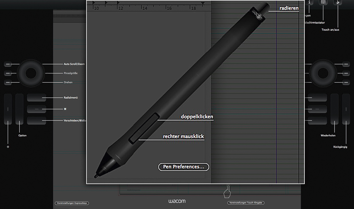 Anders als die Intuos4-Geräte besitzen die Cintiqs keine LED-Anzeigen neben den „ExpressKeys“. Bei täglichem Einsatz des Tabletts denkt man aber wie auch in Photoshop nicht mehr u?ber die zu dru?ckenden Tasten nach. Mit der Infotaste rechts oberhalb des Bildschirmbereichs können Sie jedoch eine Übersicht der aktiven Tasten belegung einblenden – beim 24HD touch haben Sie alternativ die Möglichkeit, mit einem Fu?nf-Finger-Tipp diese Darstellung einzublenden. Von dort springen Sie bei Bedarf direkt in die Systemeinstellungen und passen dort die Parameter fu?r Stift und Tablett an. Dies ist glu?cklicherweise fu?r jedes Programm getrennt möglich.