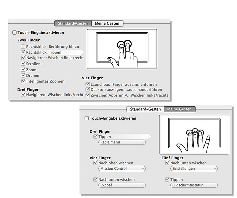 Das 24HD touch ist der erste Beru?hrungsbildschirm von Wacom. Das eröffnet nicht nur neue Möglichkeiten wie das Malen mit den Fingern (leider ohne jede Druckempfindlichkeit!), sondern verku?rzt auch die notwendigen Stiftwege: Denn Sie können damit beide Hände einsetzen! Die eine hält den Stift fu?r die „Haupt-Action“ und die andere dreht per Geste die Arbeitsfläche oder wählt neue Werkzeuge aus. Bei 24 Zoll Bildschirmdurchmesser ist das eine sehr willkommene Möglichkeit. Sie können zudem die Standardgesten anpassen als auch eigene Gesten aktivieren – alles fu?gt sich nahtlos in das Betriebssystem ein und ermöglicht ein intuitives, schnelles Interagieren mit Programmen und Fenstern.