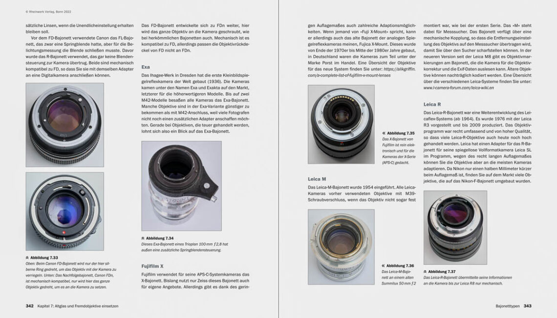 Christian Westfalen hat den verschiedenen Bajonett-Typen in seinem Buch ein eigenes Kapitel gewidmet, das rund 10 Seiten umfasst. Neben einem kurzen Abriss zur Entwicklung und möglichen Besonderheiten finden sich Abbildungen, die eine eindeutige Identifikation erlauben. Die zugegebenermaßen exotische Altix- und Pentax-110-Anschlüsse werden nicht besprochen. Darüber berichten der Altglas-Blog und das E-Book Digital fotografieren mit alten Objektiven (Band 1)