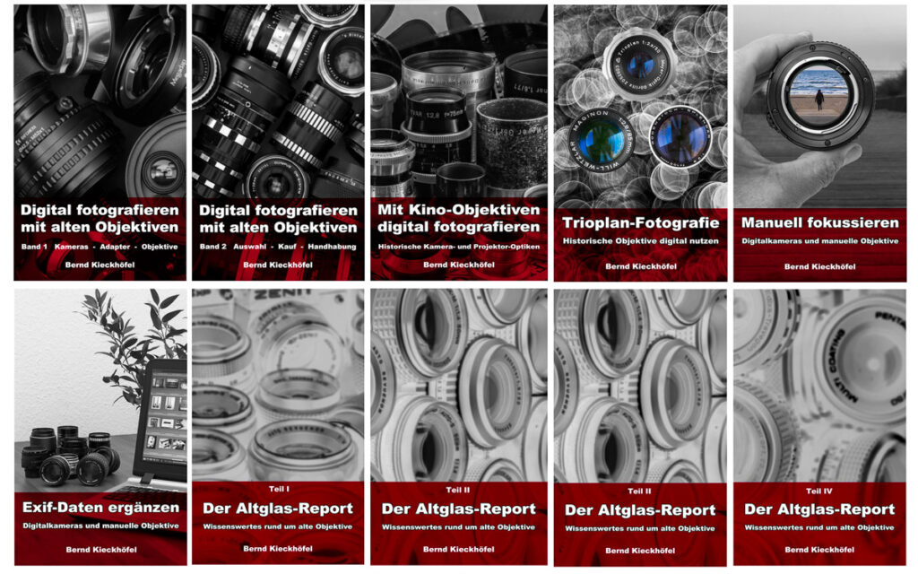 Das Trioplan E-Book und die erste Version von „Digital fotografieren mit alten Objektiven“ erschienen 2016. Aus heutiger Sicht wirkt ihr Umfang spärlich. Heute ergänzen zehn E-Books die gedruckten Bücher mit vielen Details: 3400 Seiten und 2500 Bilder ergänzen den Text.