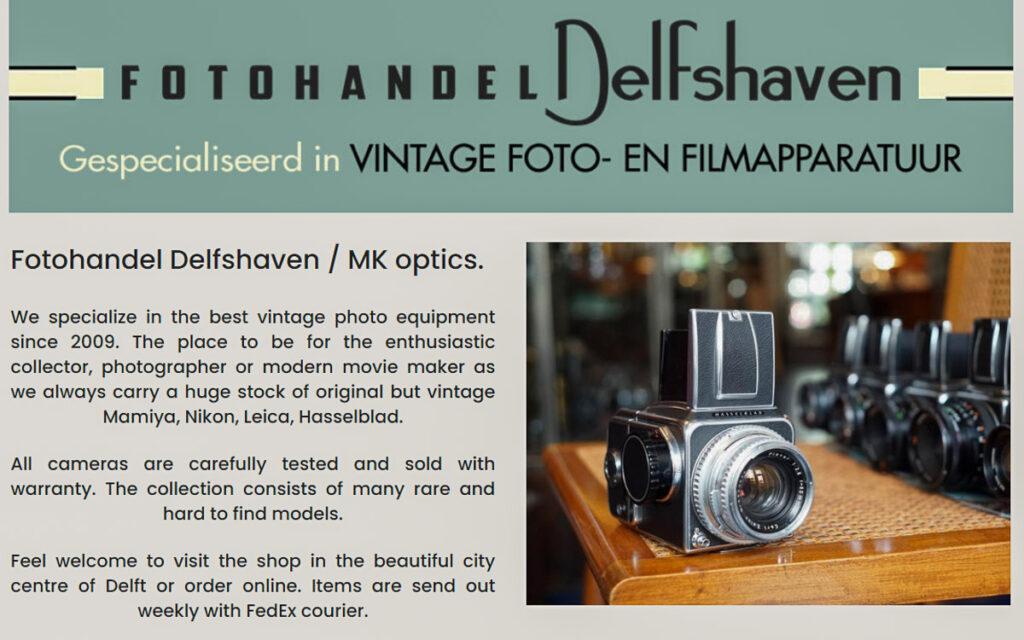 Click & surr ist seit 2017 mit einem besonderen Geschäftsmodell erfolgreich. Den Unterschied macht die eigene Werkstatt: Alle Kameras werden vor dem Verkauf überprüft, aufbereitet und im Gewährleistungsfall auch repariert. Gefragte Spiegelreflexkameras von Canon, Nikon und Olympus kosten zwischen 150 und 400 Euro mit Objektiv, Sucherkameras sind etwas günstiger. Seit 2009 ist der Fotohandel Delfshaven aktiv. Mit einem Ladenlokal in Delft, einem Online-Shop und Amsterdam Camera Repairs als Partner. Die eingehende Prüfung aller Angebote ist selbstverständlich und mündet in präzisen Zustandsbeschreibungen.