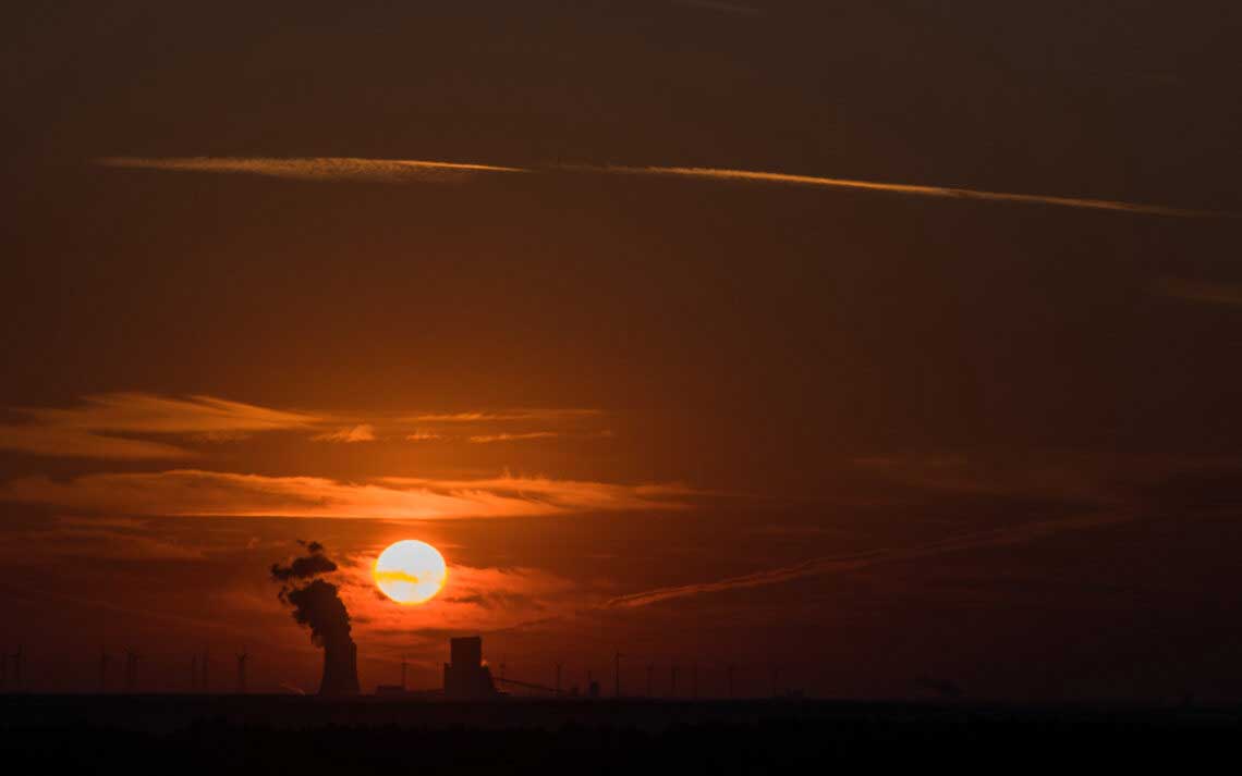 Endlich angekommen ist noch ein 30 Meter hoher Stahlturm zu erklimmen. Die Perspektive von der Dachterrasse überzeugt nicht, wieder runter. Eine Aussichtsplattform in der Mitte bietet den optimalen Blick auf den Industriepark Schwarze Pumpe, mit der jetzt hinter dem Horizont aufsteigenden Sonne.