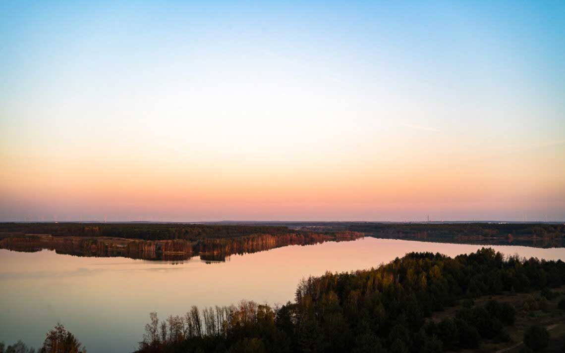 Die Anreise aus Cottbus sollte laut Google Maps eine gute halbe Stunde dauern. Frühes Aufstehen für den Sonnenaufgang ist Mitte September noch angesagt, doch 4 Uhr 30 war unfreiwillig großzügig kalkuliert. In kleineren Hotels ist vor 6 Uhr oft nicht mal der Fahrstuhl in Betrieb. Also Gepäck schultern, über die Treppe zum Notausgang und das Gebäude umrundend zum Parkplatz. Im Dunkeln aus einer unbekannten Stadt heraus ein unbekanntes Ziel anfahren kann trotz Navi nerven. Eine unerwartete Umleitung ist meistens unproblematisch. Nasse Landstraßen verschlucken das Scheinwerferlicht. Lange Rotphasen von Baustellenampeln im Irgendwo zehren um diese Uhrzeit an der Geduld. Die Anzahl der auf 30 Km/h limitierten Durchfahrten unbekannter Straßendörfer überrascht, ebenso die dort fest installierten Blitzer. Mühsam erstrittene Ruhe lärmbelästigter Anwohner. Mein Lichtblick: Die schon geöffnete Tankstelle an der B96 verspricht kurz vorm Ziel Coffee-to-go und was zu beißen fürs Frühstück. Nachher, in luftiger Höhe auf dem Aussichtsturm.