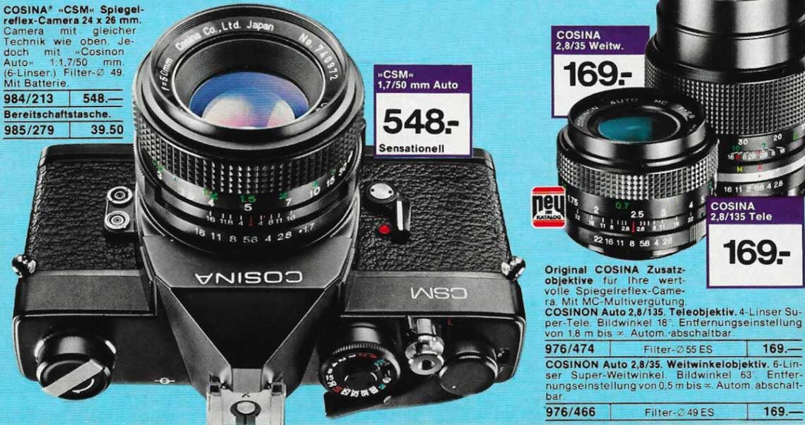 Als Abgrenzung zum Mitwettbewerb setzte Neckermann bei Spiegelreflexkameras und Objektiven auf bekannte Markennamen. Im Katalog von 1979 finden sich auch Sets von Cosina mit besagtem Objektiv, garniert mit einem für die Zeit typischen Slogan: „Kenner kaufen Cosina“. Als günstige Ergänzung bot man eine überschaubare Auswahl üblicher OEM-Objektive als Handelsware unter mehr oder weniger fantasievollen Namen an, wie Exaktar oder Weltblick