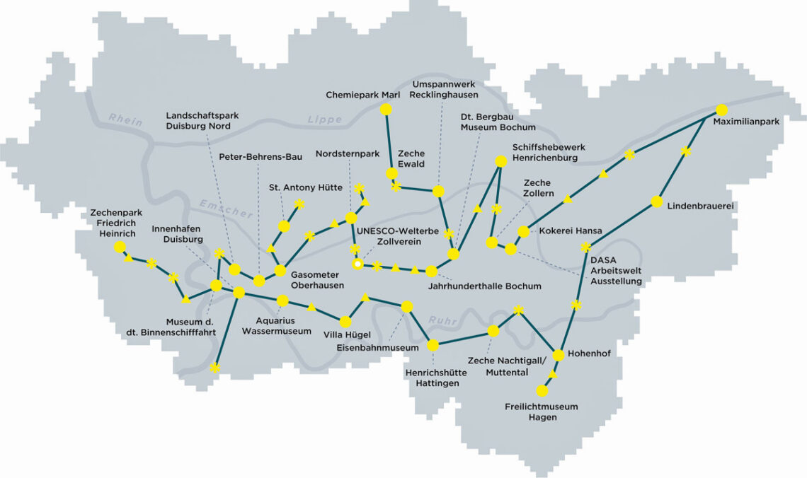 Erster Überblick: 27 Ankerpunkte, 17 Aussichtspunkte und 19 Arbeitersiedlungen. Darüber hinaus existieren mehr als 30 sogenannte Themenrouten mit über 1000 Sekundärstandorten auf der Route der Industriekultur (Regionalverband Ruhr, RVR).