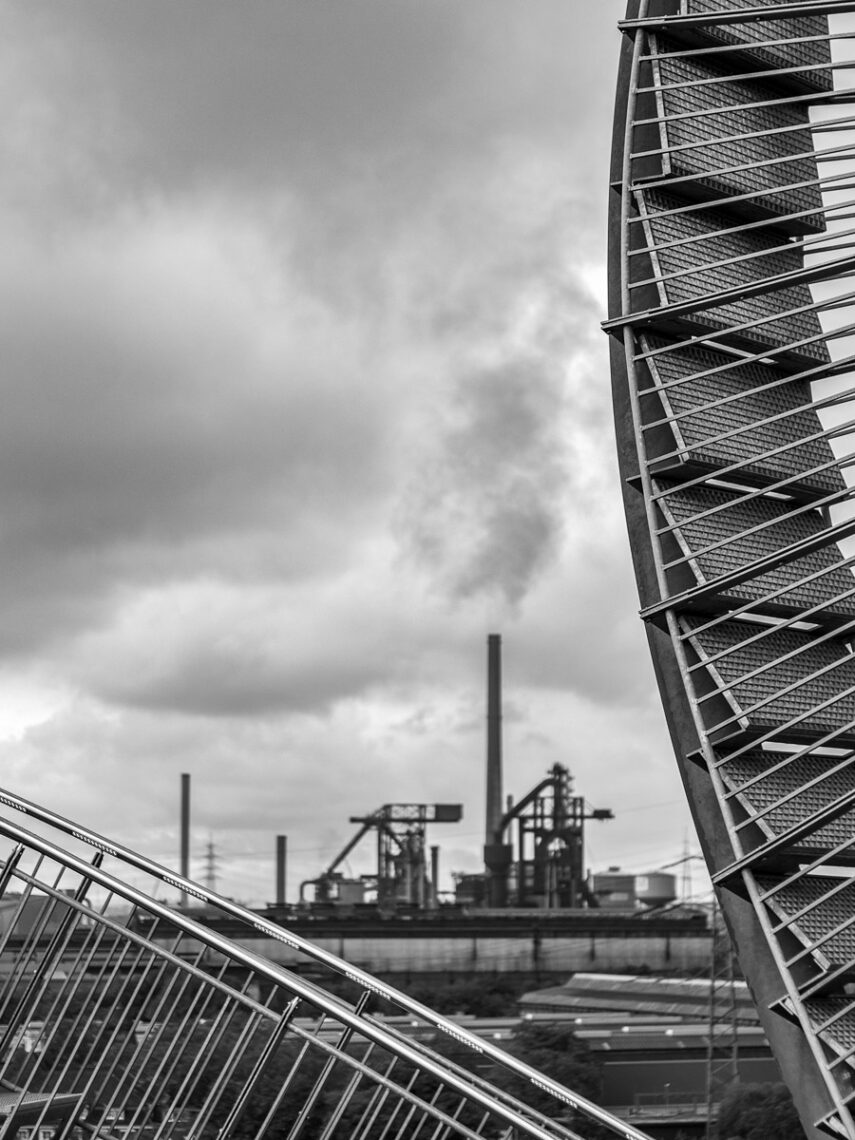 Die begehbare Stahlskulptur Tiger & Turtle in Duisburg ist eine Attraktion, die nicht zur Route der Industriekultur gehört. Das Hüttenwerk im Hintergrund ist immer noch aktiv (Auto Revuenon 50/1.9).