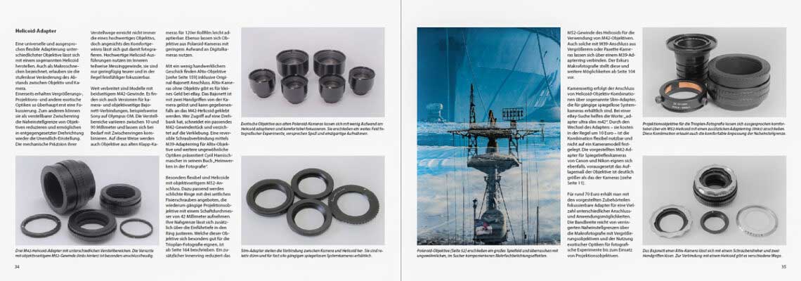 Das Kapitel „Do-it-yourself-Adapter“ erklärt den Anschluss der Polaroid-Objektive mit Streulichtblende: Maße für Trägerplatten und Bohrungen, Tipps für den Umgang mit dem Kreisschneider und Anregungen zur Motivsuche eingeschlossen. Neu ist auch das Helicoid-Kapitel. Es stellt verschiedene Ausführungen und nützliches Spezialzubehör vor. Hier gibt es Einblick in das komplette Inhaltsverzeichnis.