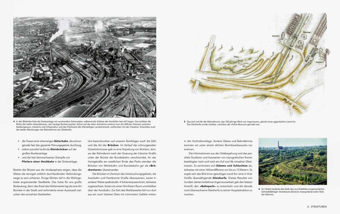 Die Annäherung an das Gegebene erfolgte primär über die Strukturen alter Schienen- und Wasserwege. Die Geometrie ihrer Verläufe wurde unverändert übernommen. Latz entwickelte Methoden zur Gestaltung: Gleistrassen machte er zu Promenaden und Alleen oder ließ sie als begehbare Stege in luftiger Höhe über Erzbunker laufen. Der Klarwasserkanal und die restaurierte Pfeilerbahn entlang der Emscherpromenade entwickelten sich zu einem weiteren Wahrzeichen des Parks. Neben alten Fotos illustrieren Skizzen im Buch die Visionen und ihre schrittweise Umsetzung, teilweise unterstützt von aktuellen Luftbildern. Besonders klar treten die umgenutzten Strukturen auf einem Winterbild hervor, dass dem Kapitel III vorangestellt ist. Erkunden lassen sich die neuen Wege zu Fuß und mit dem Fahrrad.