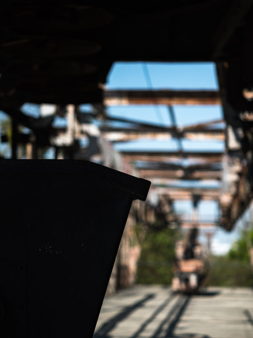 Der direkte Weg vom Parkeingang zur Schachtofenbatterie ist ungefähr 1,5 Kilometer lang. Mit Abstechern rechts und links ins Gelände sowie diversen Auf- und Abstiegen kann es auch im Frühjahr spätestens gegen Mittag mit viel Gepäck zur schweißtreibenden Wanderung werden. Für mich hat sich ein kleiner Sling-Bag bewährt, mehr dazu hier. Darin lassen sich zwei Kameras mit drei Objektiven bequem und gut erreichbar unterbringen: Nikon Z6 mit Nikon-Zoom E 75-150/3.5, Olympus OM-D E1 mit PEN-Objektiv 38/1.8 sowie der Trioplan-Nachfolger Domiplan 50/2.8.