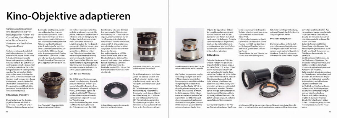 Im kreativen Umgang mit Objektiv-Namen sind auch die Hersteller von Kino-Optiken geübt. Selbst zwei Objektive vom selben Produzenten mit gleicher Bezeichnung sind keine Garantie für identische Eigenschaften. Mitunter wurden bekannte und gut eingeführte Objektiv-Namen für die nächste Generation übernommen, trotz grundlegend anderem optischen Design. Wollensak nutzte den Namen Raptar erst für ein Triplet- und später für ein Gauß-Design. Was Erinnerungen an Werbesprüche wie „Jetzt noch besser“ weckt – immerhin, ein Gauß-Design hat in der Regel doppelt so viele Linsen auf wie das Triplet. Aber Kino-Objektive sind nicht nur in dieser Hinsicht speziell, auch das Fotografieren damit ist eine Herausforderung.