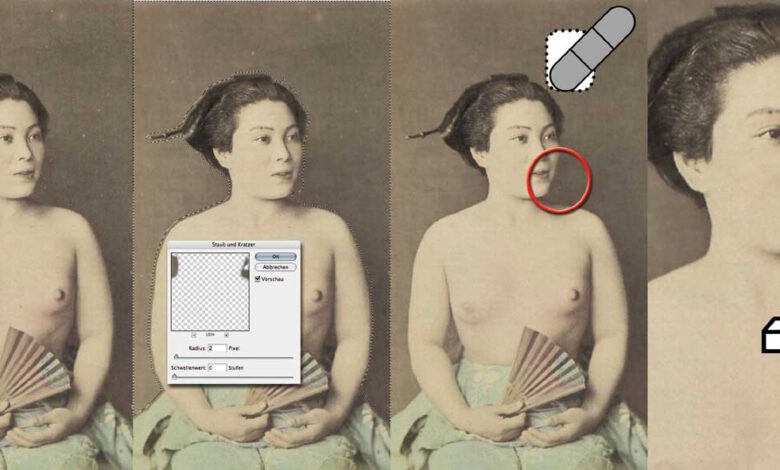 Kleine Defekte wie Kratzer oder Flecken bieten alte Fotos im Überfluss. Dagegen helfen wahlweise das Stempel-Werkzeug oder die Reparatur-Pinsel. Welches Tool man einsetzt, hängt nicht nur von persönlichen Vorlieben oder der eingesetzten Photoshop-Version, sondern auch von den Bildfehlern selbst ab. Den Reparatur-Pinsel – oder den noch einfacher zu bedienenden Bereichsreparatur-PinselMehr