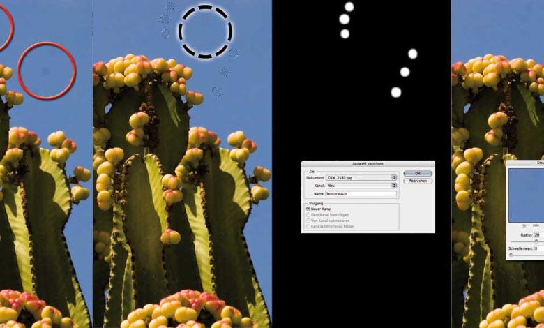 Wer Senorstaub von einem oder mehreren Bildern entfernen muss, dies aber nicht im Camera Raw-Modul von Photoshop tun kann oder will, muss sich anders behelfen. Wählen Sie zunächst in einem Referenzbild ein Staubkorn oder mehrere so präzise wie möglich aus und speichern Sie die Auswahlen in einem Alphakanal. Dann ladenMehr