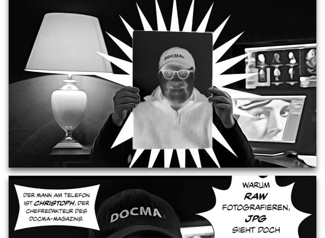 Den aktuellen DOCMA-Comic zum Thema „Raw oder JPG?“ lesen Besitzer der kostenlosen DOCMA-App jetzt gratis auf ihrem Mobilgerät. Ganz gleich ob iPhone, iPad, Samsung Galaxy oder ein anderes tragbares Gerät, die DOCMA-Magazin-App mit allen Facebook-News, dem Zugriff auf die DOCMA-Webseite und dem aktuellen DOCMA-Comic gibt es kostenlos für iOS, AndroidMehr