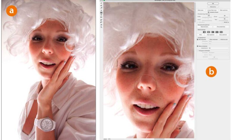 Aufgrund der kurzen Aufnahmedistanz ist die Nase im Beispielbild (a) ein wenig zu betont und wird der Natur nicht gerecht. Eine Korrektur mit den neueren Werkzeugen »Verformen« und »Formgitter« wäre hier möglich, aber greifen Sie doch auf das bewährte »Filter > Verflüssigen« (»Strg/Cmd-Shift-X«) zurück. Im Arbeitsbereich des Filters (b) wählenMehr